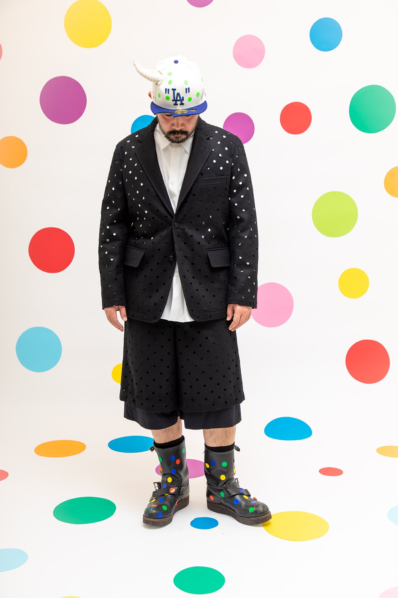 メルトンにパンチングで穴をあけたキュロット。 ヒザ下丈。タイプライターの裏地付きでパンツは見えません。 表地:毛90%ナイロン10% 裏地:綿100% モデルはMサイズ着用